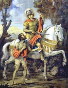 In quell’occasione nella parete sopra l’altare fu posizionato un quadro che raffigura san Martino a cavallo e il povero: lo vedete riprodotto qui sotto. È un lavoro di buona fattura pittorica, in cui San Martino è raffigurato nel gesto famosissimo di dividere il mantello con un povero. A una prima occhiata, la tela sembrerebbe riconducibile sotto il profilo stilistico al secondo Ottocento, ma non è mar menzionata nelle carte delle visite pastorali. Un grande cavallo bianco, con zampa anteriore alzata e bardature dorate, riempie tutto il quadro, un cavallo perfetto the richiama i meravigliosi animali dei pittori e degli statuari del Quattrocento. Martino, futuro vescovo di Tours (oggi in Francia), è effigiato da giovane come un soldato romano, con il cimiero sull’elmo, corazza sul petto, maneggia la spada nell’atto di tagliare per il povero un pezzo del suo mantello. Il povero, in piedi, scalzo, coperto nelle cosce ma nudo nel torace, rivolge lo sguardo implorante verso il cavaliere. Gli alberi molto carichi di fogliame e il cielo sanno di Ottocento romantico. Il pittore ha lasciato il suo nome e la data nell’angolo inferiore destro della tela: “S. Tosi [o Rosi] 1945”, una data che spiega la mancata citazione nelle visite pastorali suddette. Forse il pittore è partito da un’immaginetta devozionale di disegno ottocentesco raffigurante il santo, il che spiega la prima impressione che se ne riceve. La tela ha una cornice centinata di gusto settecentesco, in tema con le modanature settecentesche esterne e interne alla chiesa.